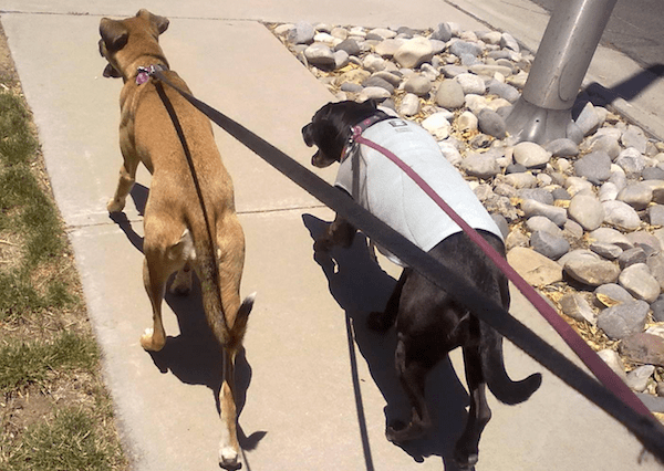 At this point I was desperate and I enrolled in a 6-week “walking with your dog on leash” class. Mostly, we used treats as bait to get our dogs to heel. Supposedly, you can eventually decrease the frequency in which you are treating. When the dog pulls ahead, you gently change direction and reward when they resume walking with you. This was really successful with Daisy during the chicken every two seconds phase. But as I would decrease the frequency of treating, she would inevitably lose interest in the practice altogether. Sometimes she’d even lose interest in the actual treats if I didn’t change it up often. I practiced this method off and on for a year or two, but eventually decided the effort was not worth the results. So, we were back to pulling. And then I got another dog, so now it was two against one.